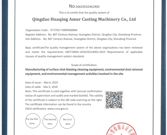 Recently, Huqing Amur successfully passed the TUV and ISO 9001:2015 quality management system upgrade certification, with the scope covering the entire process of shot blasting machine research and development, production, sales, and after-sales service. This certification represents a comprehensive audit and endorsement of the company’s quality management system by an authoritative body, signifying that Huaqing Amur Casting […]